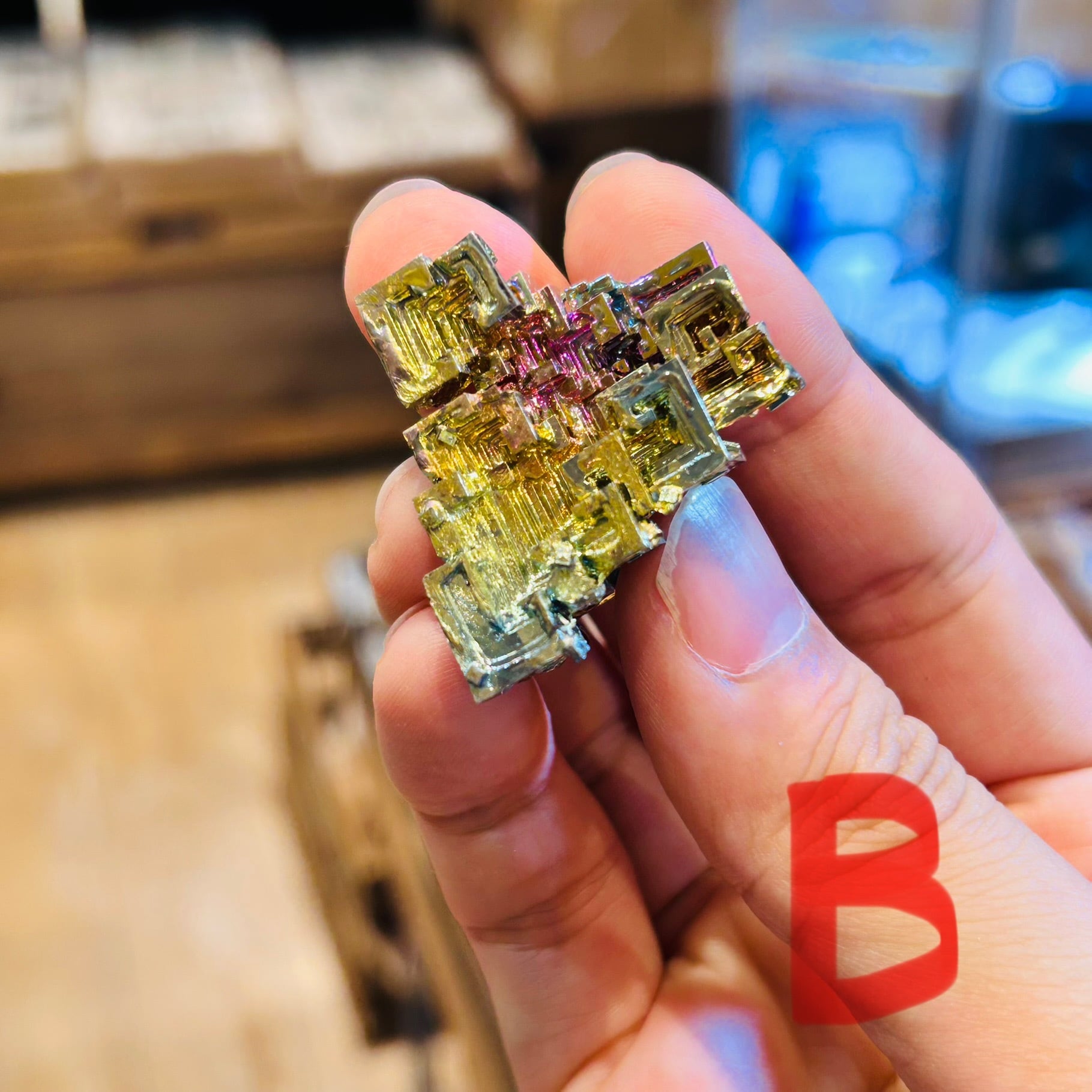 ビスマスを加熱して溶かし、ゆっくり冷やすことで作られる人工の結晶です。酸化膜によって表面が虹色に輝く独特な幾何学模様が特徴で、金属光沢も持っています。