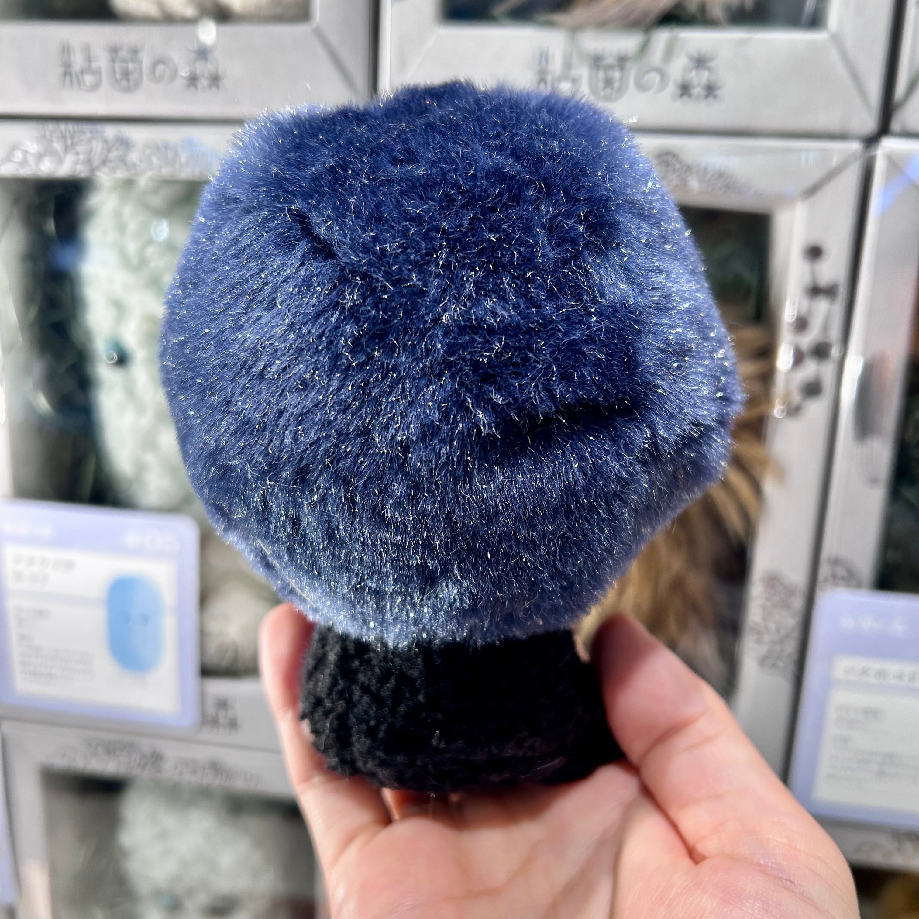 パイル織物の産地、和歌山県高野口からお届けする粘菌のぬいぐるみ。きらりと光るラメ糸の入った「シルバームートン」を使用し、ルリホコリのキラキラした質感を表現しています。 まんまるな頭と黒い軸足が特徴です。お尻にはおもりが入っているので、自立しやすくなっています。職人の手仕事により、一体ずつ個性があります。